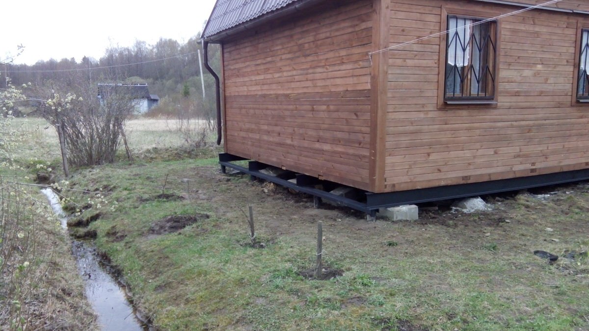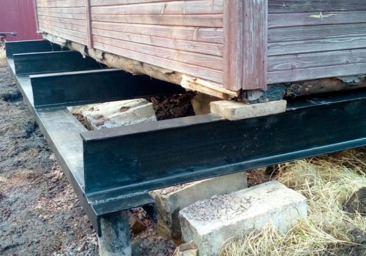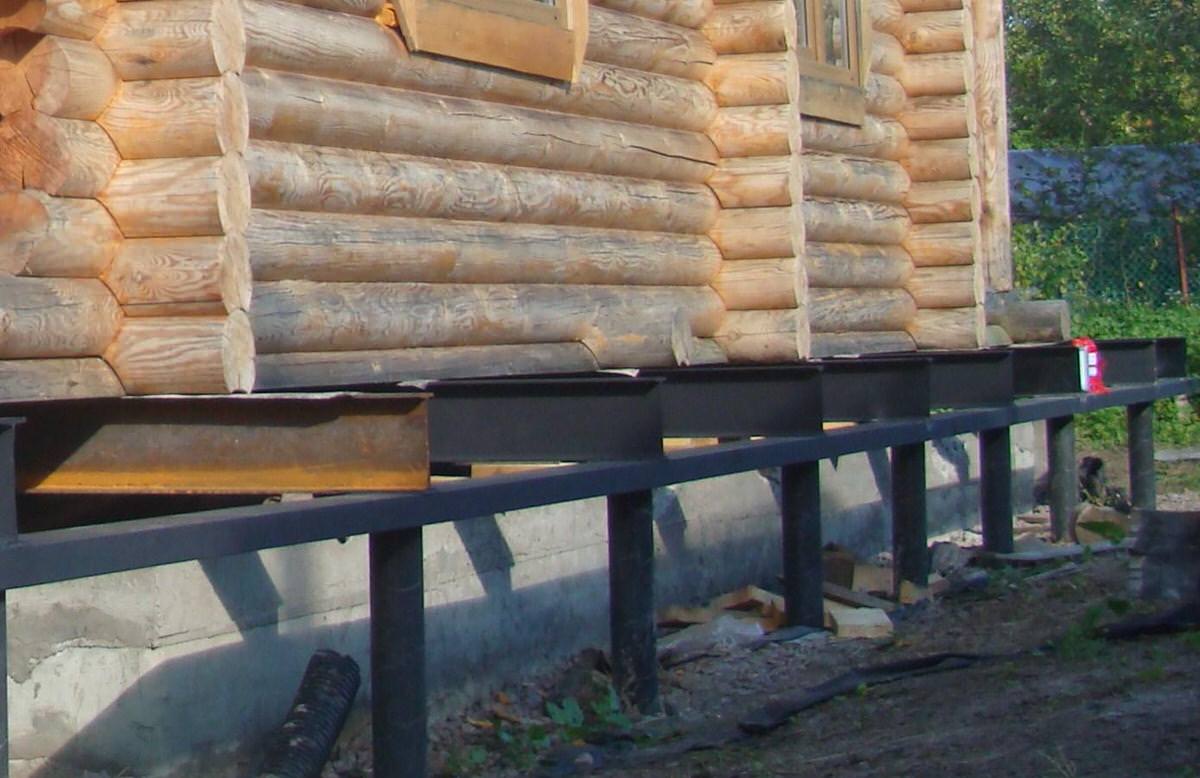Привариваем оголовки и ростверк из металлопрофиля. Обвязка выполняется швеллером или двутавром. После этого остается поставить дом на новое основание.