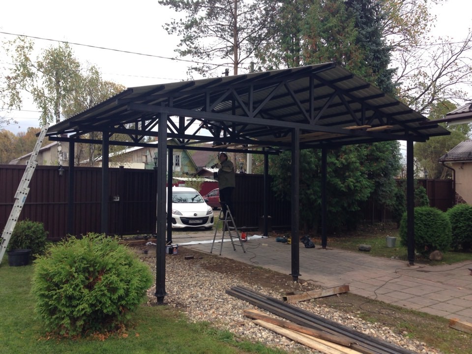Обычно примыкают к дому под углом в 30-35о и защищают веранды, террасы или крыльцо от солнечных лучей и осадков.