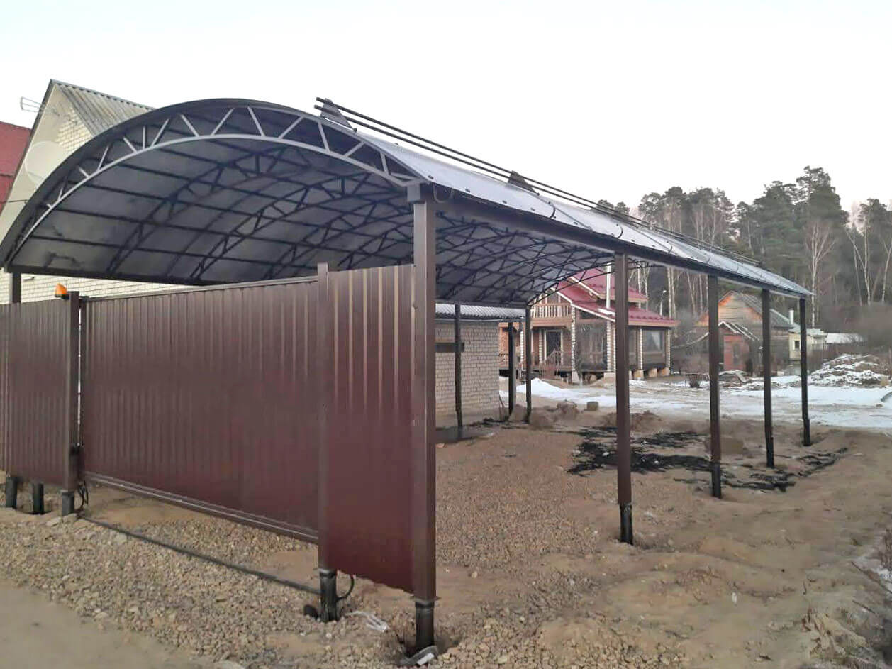 Полукруглая кровля из металла или поликарбоната крепится к каркасу в виде арки.